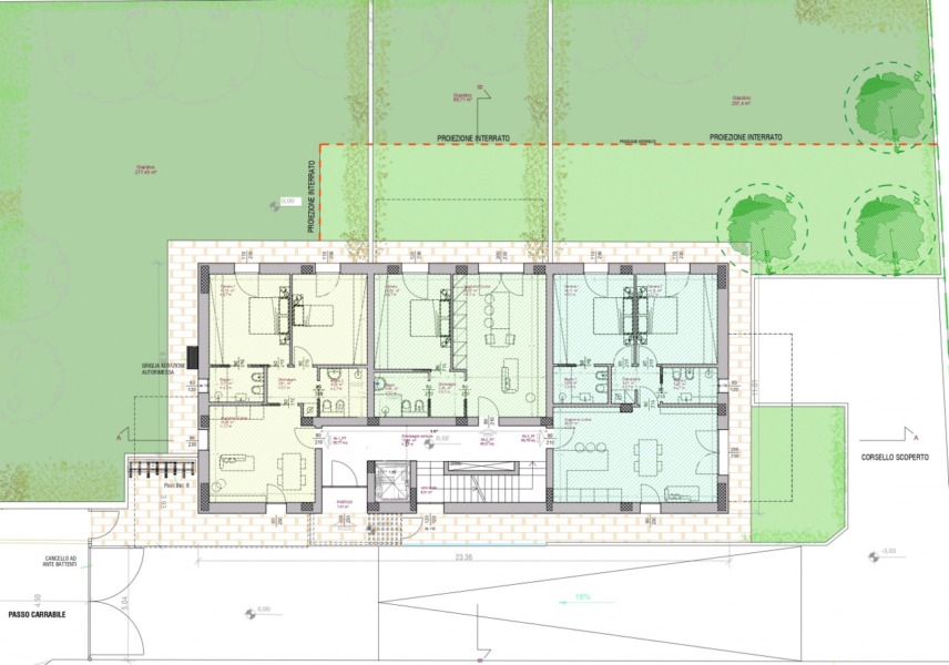 I dettagli distintivi includono pavimenti in gres porcellanato che aggiungono calore agli spazi interni e impianti moderni che assicurano efficienza energetica e massimo comfort.