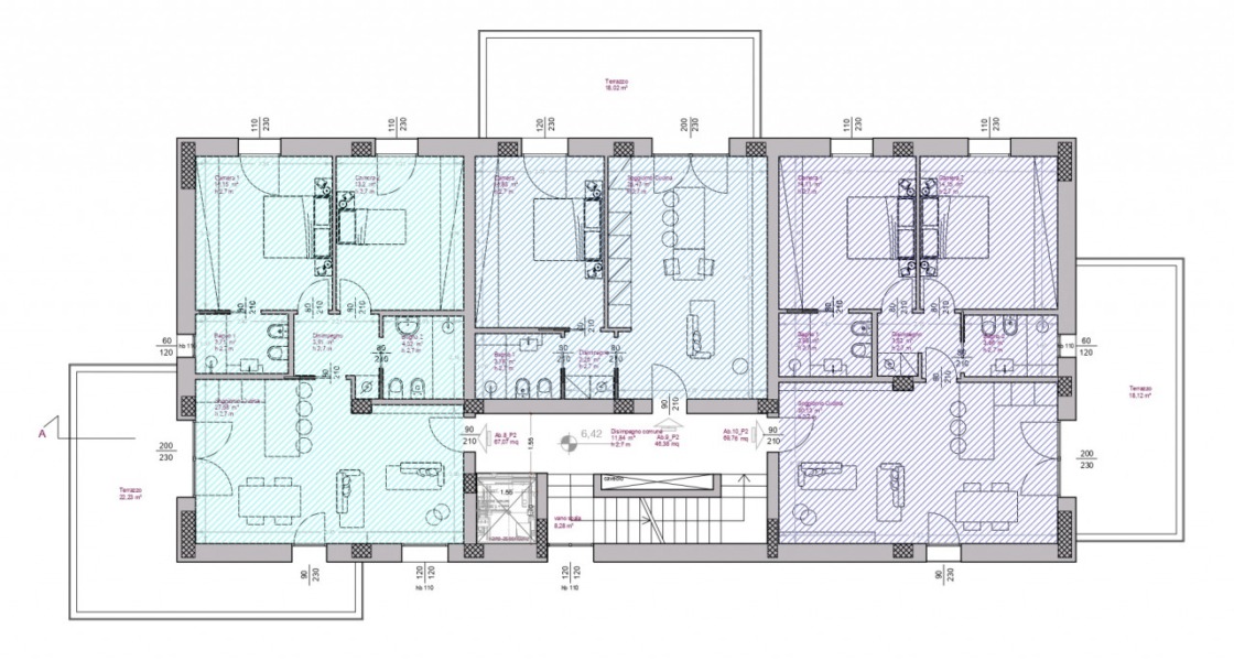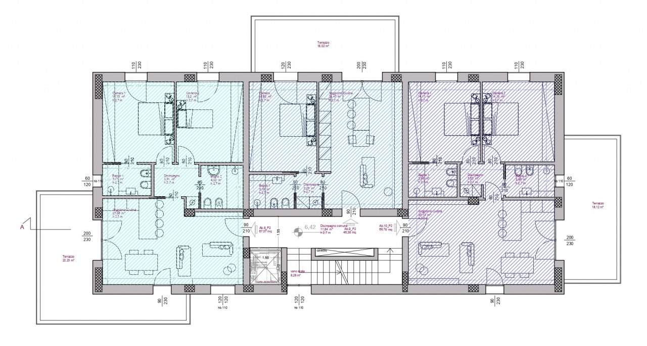 I dettagli distintivi includono pavimenti in gres porcellanato che aggiungono calore agli spazi interni e impianti moderni che assicurano efficienza energetica e massimo comfort.