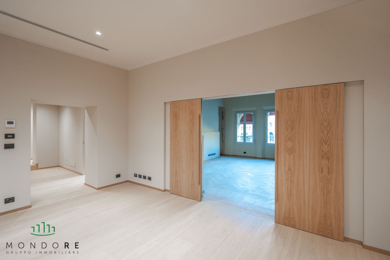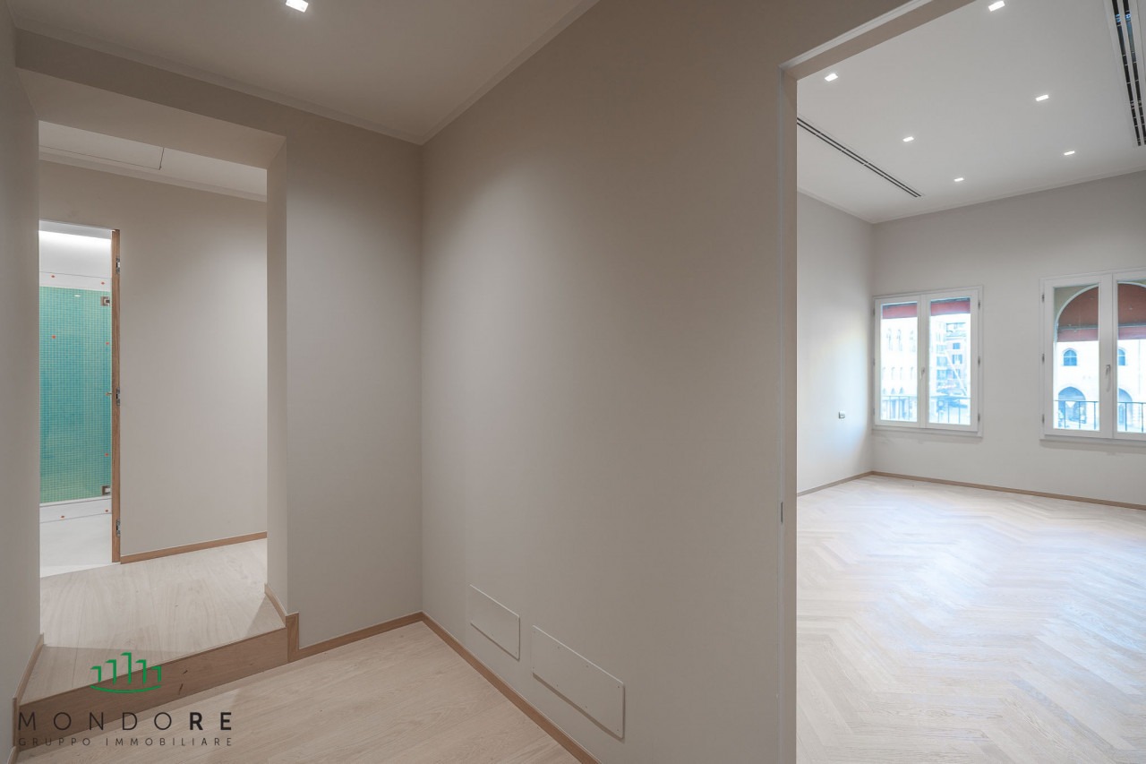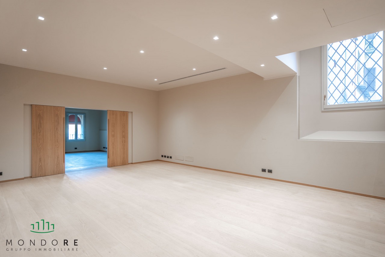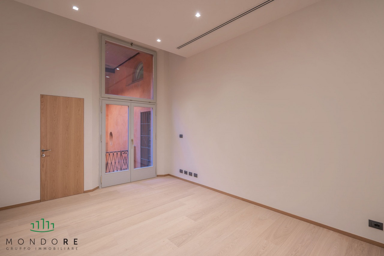 L’appartamento vanta ambienti luminosi e ariosi che possono facilmente adattarsi a qualsiasi layout lavorativo moderno mentre conserva il fascino della storia bolognese. Ogni stanza è dotata di ampie finestre che non solo illuminano gli spazi ma offrono scorci indimenticabili sul centro della città.
