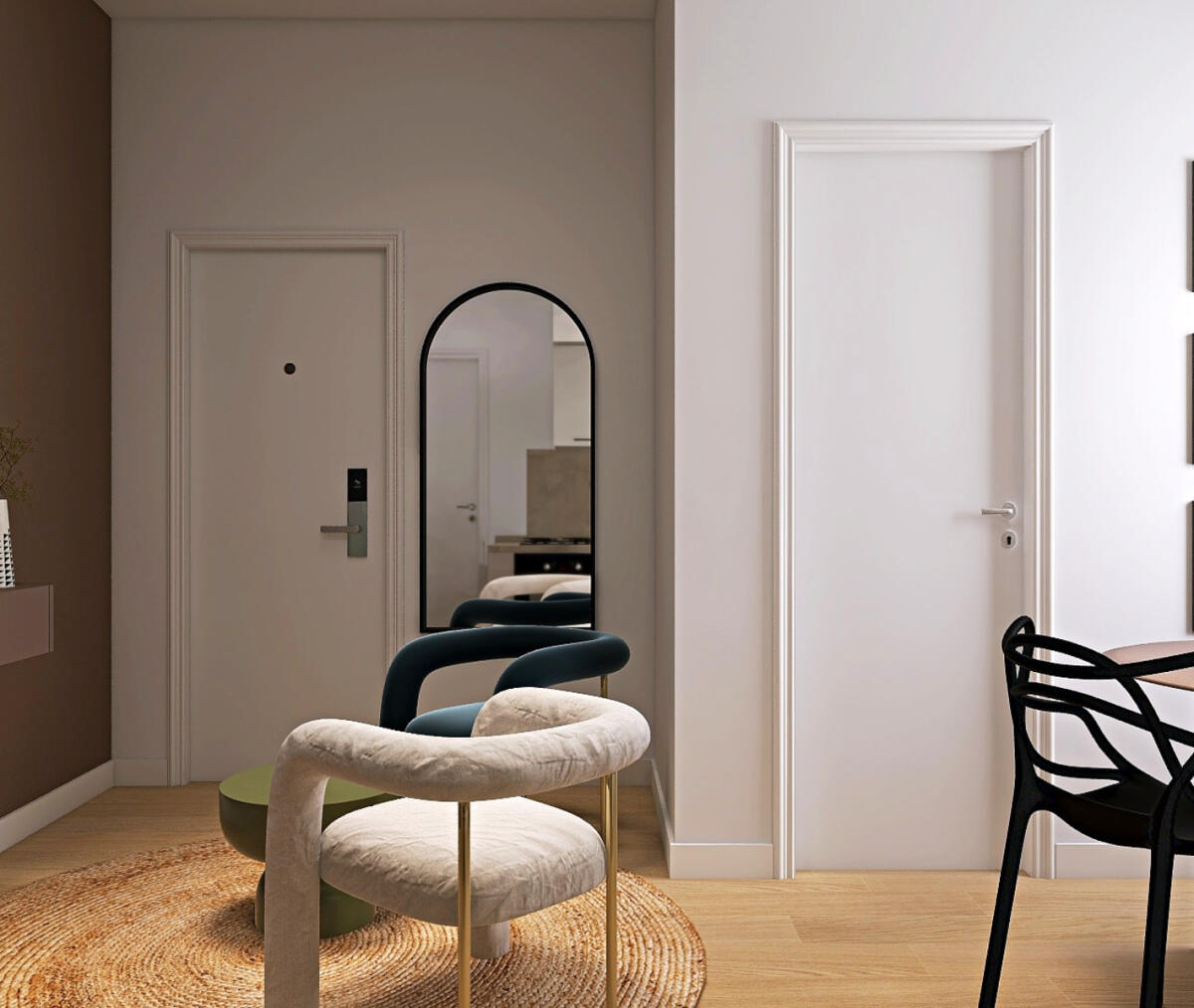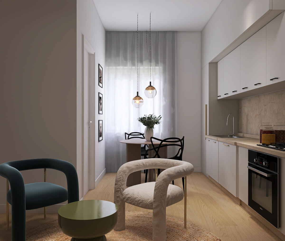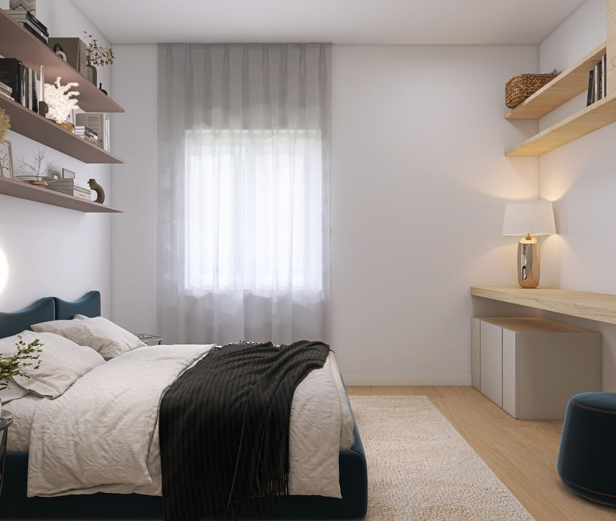 Le immagini pubblicate rappresentano un’ipotesi di riqualificazione degli ambienti, con una distribuzione interna studiata per valorizzare al meglio la zona giorno, la camera matrimoniale e il bagno finestrato.