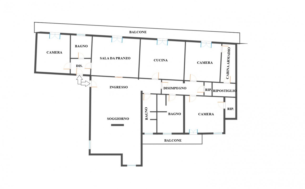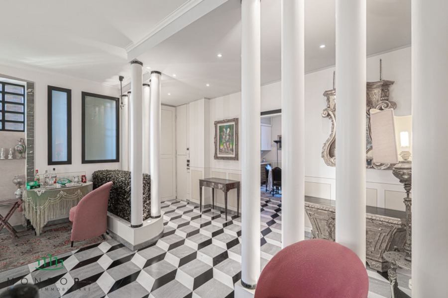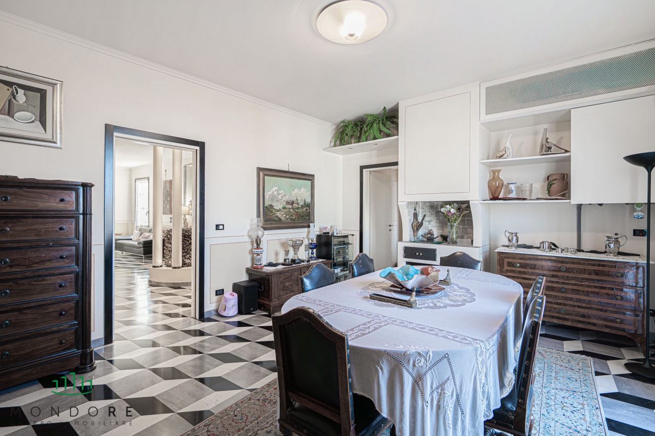 La presenza di due ingressi distinti al piano offre anche la possibilità di frazionare comodamente l’appartamento in due porzioni autonome. Gli attacchi per la cucina già predisposti nella sala da pranzo consentono infatti di ricavare un bilocale indipendente, mantenendo la restante parte come unità principale.