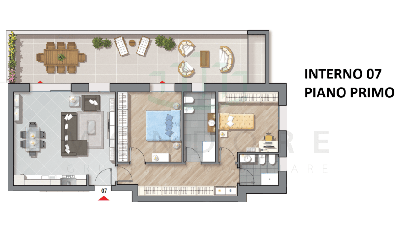 Appartamento composto da: ingresso su sala/soggiorno pranzo, 1 camera matrimoniale, 1 camera singola, 2 bagni finestrati, terrazzo abitabile di 27 mq , volendo garage di mq 20 circa.