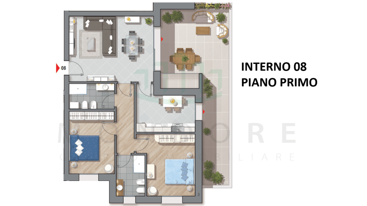 Appartamento composto da: ingresso su sala/soggiorno pranzo, cucina abitabile, 1 camera matrimoniale, 1 camera doppia, 2 bagni finestrati, terrazzo abitabile di 20mq circa, volendo garage di mq 20 circa.