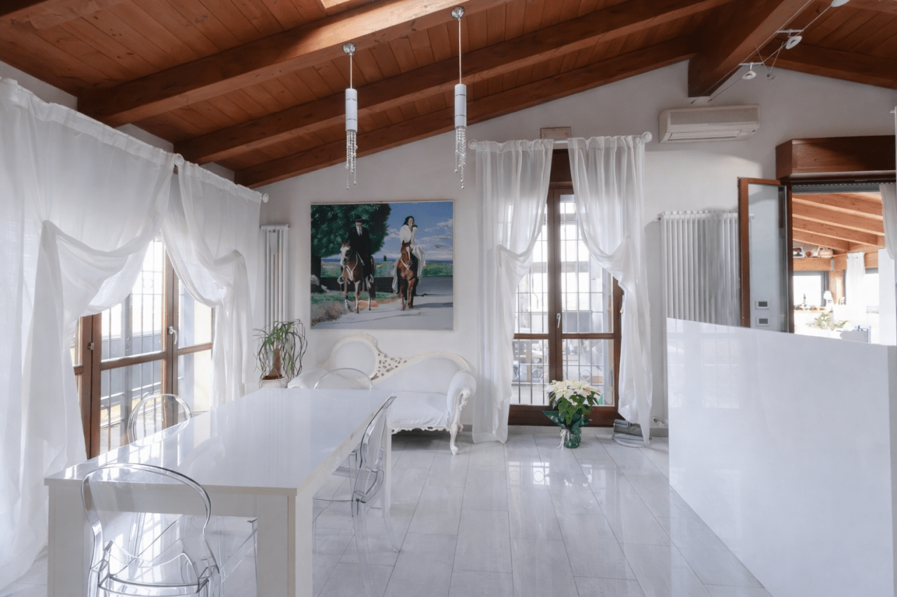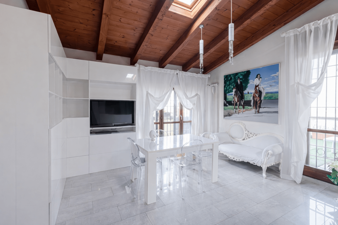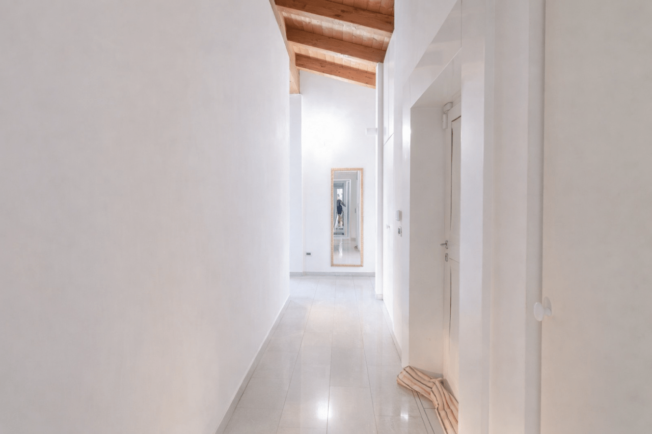 L’ingresso accoglie in un ambiente caldo e curato, con finiture ricercate, travi in legno a vista e spazi luminosi. Il soggiorno con cucina open space si apre su una splendida veranda di 30 mq, vivibile tutto l’anno. La zona notte comprende tre camere da letto: la padronale con bagno en suite, una seconda camera con terrazzino loggiato e una terza stanza. Completano il reparto notte un secondo bagno finestrato e una comoda lavanderia.