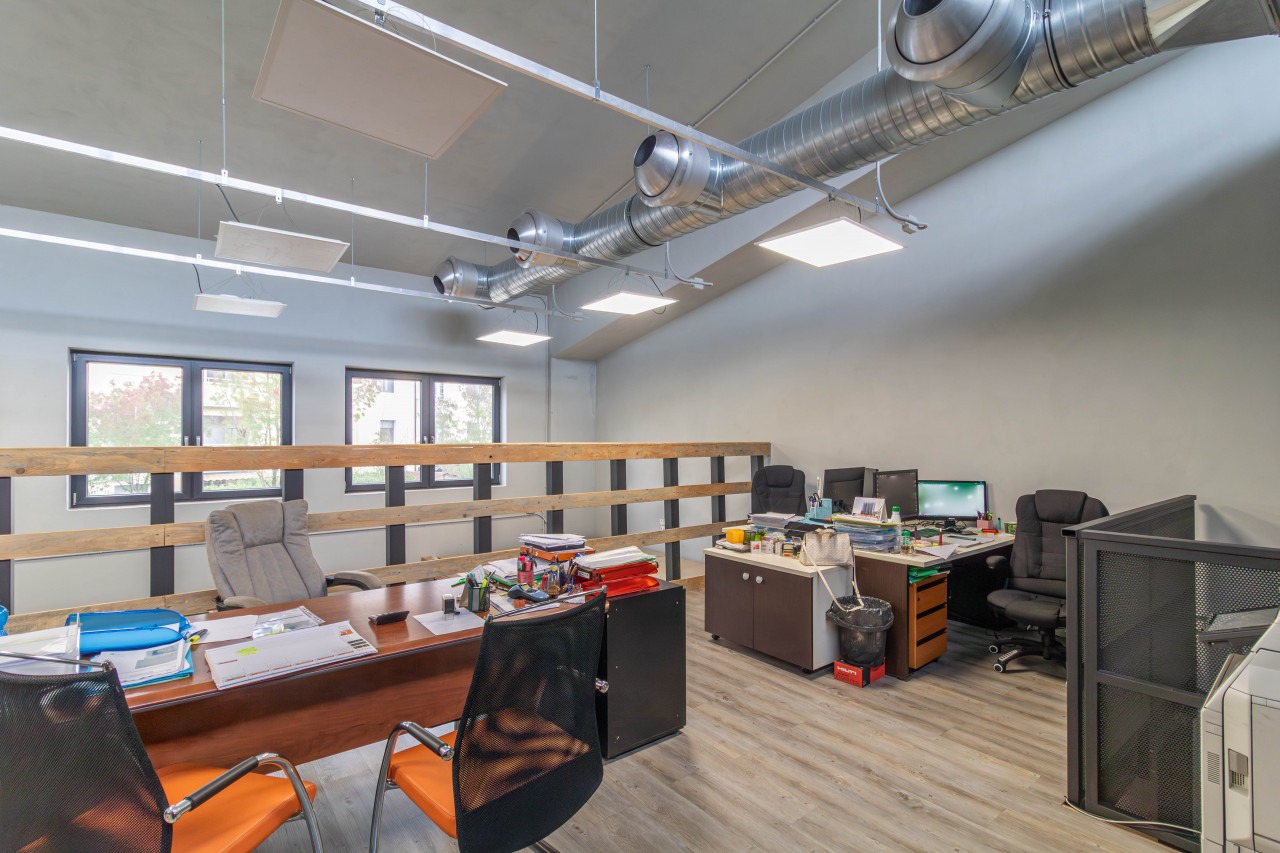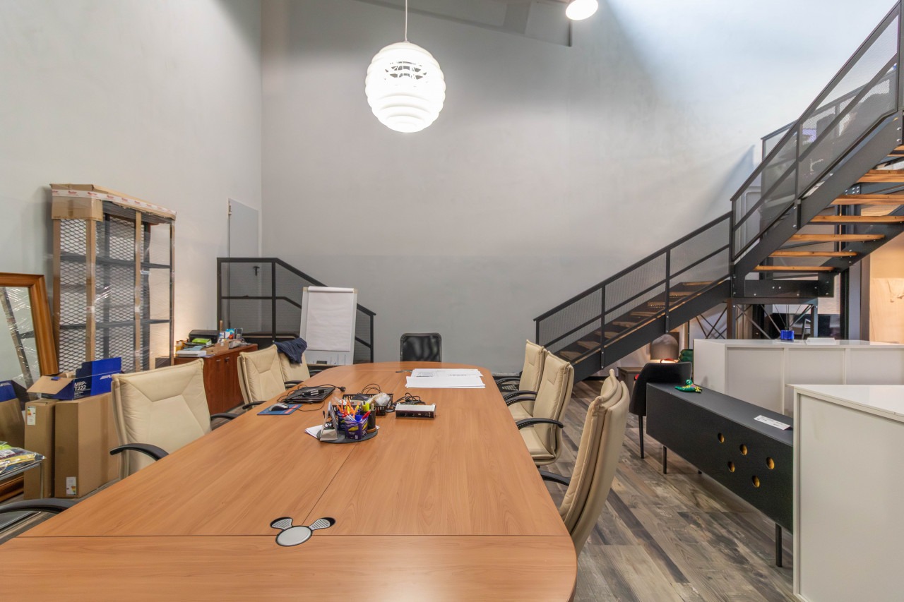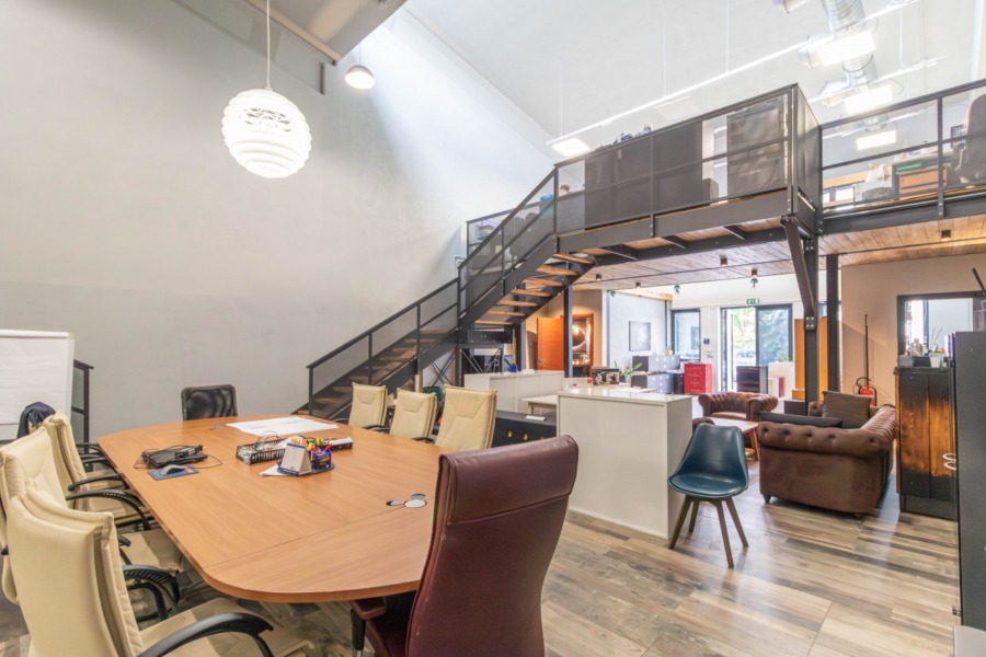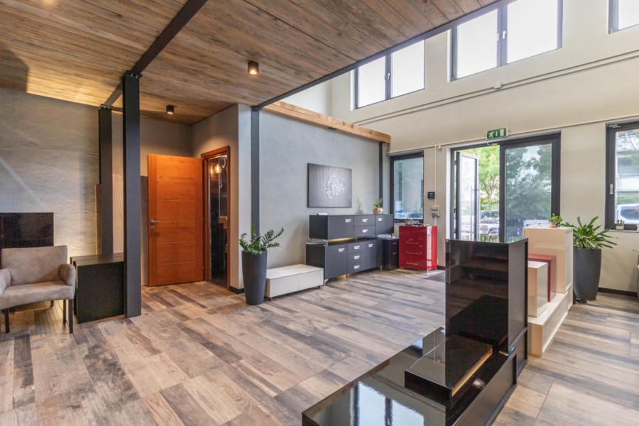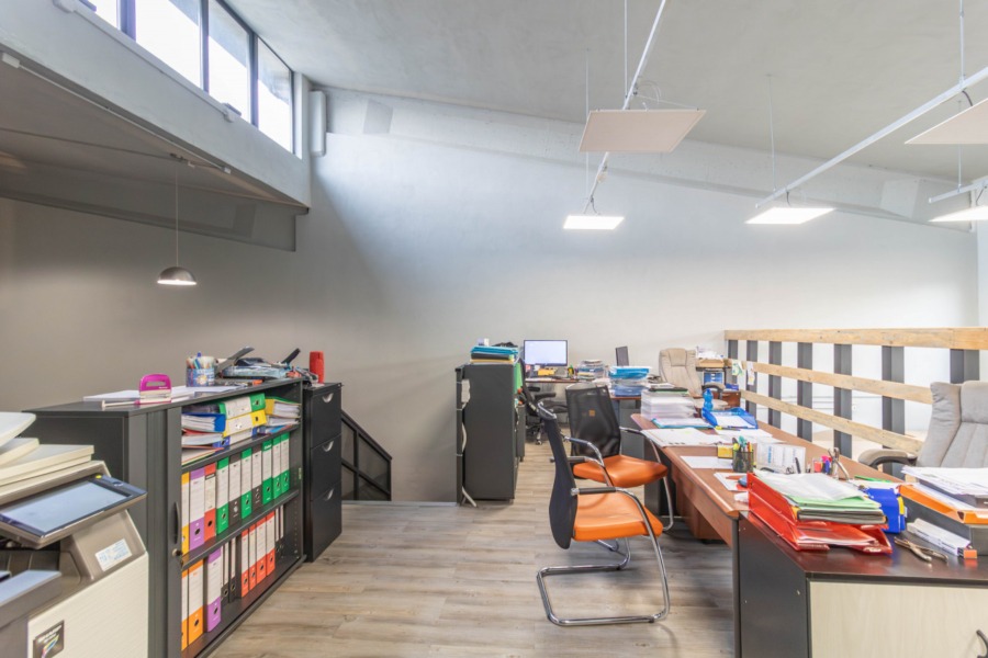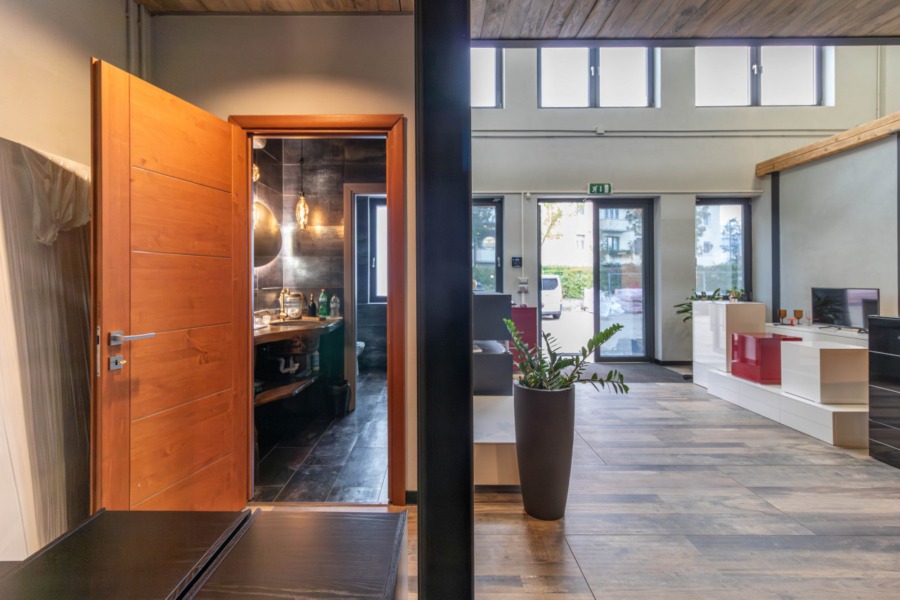 L’ingresso si apre su un luminoso Open Space dotato di un elegante ufficio di rappresentanza e una sala riunioni arricchiti da un suggestivo soppalco in carpenteria metallica con finiture in legno. La struttura è equipaggiata con impiantistica all’avanguardia e cablaggio conforme alle normative vigenti.