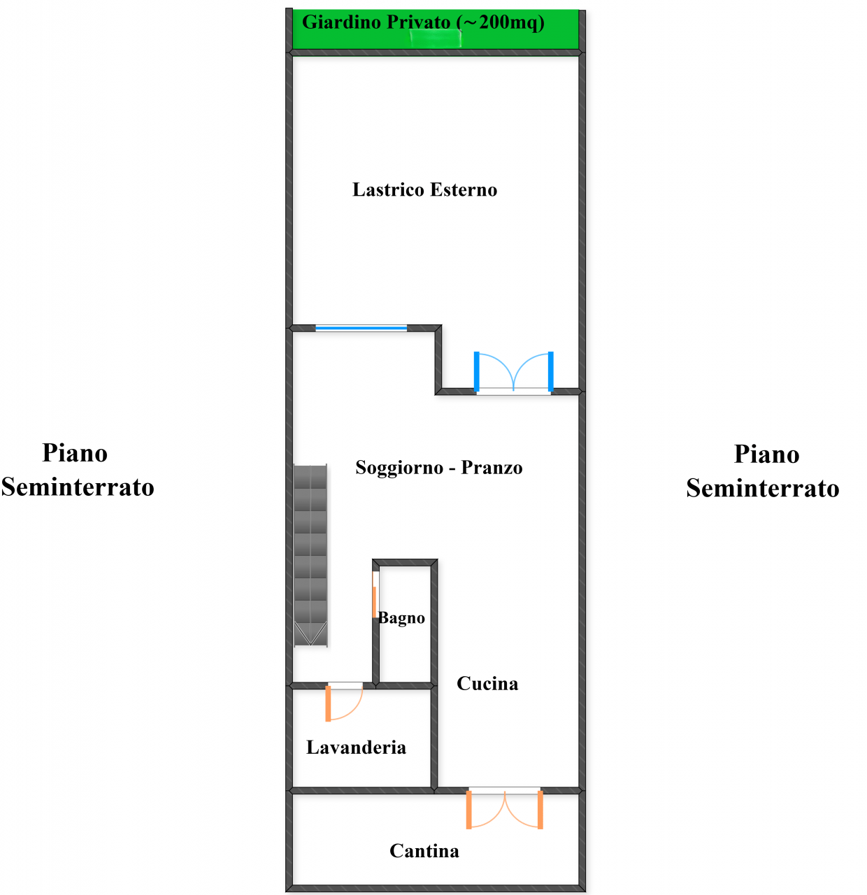 Il piano seminterrato ospita una grande zona soggiorno-pranzo con accesso diretto al giardino privato, che comprende anche un comodo lastrico solare di circa 60 mq, ideale per un utilizzo pratico e funzionale. Completano il livello una lavanderia, un bagno e un’ampia cantina, utile e versatile.