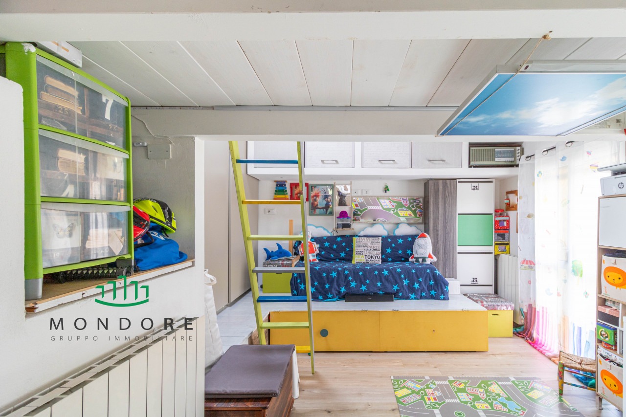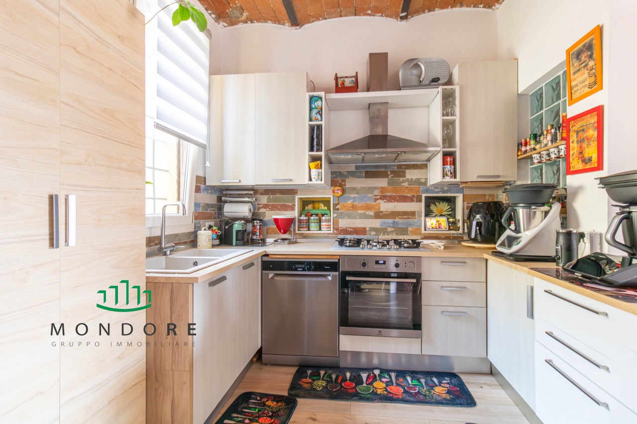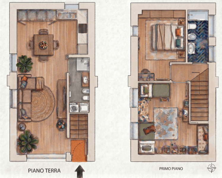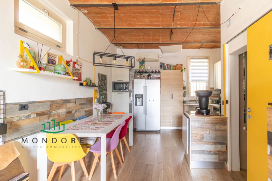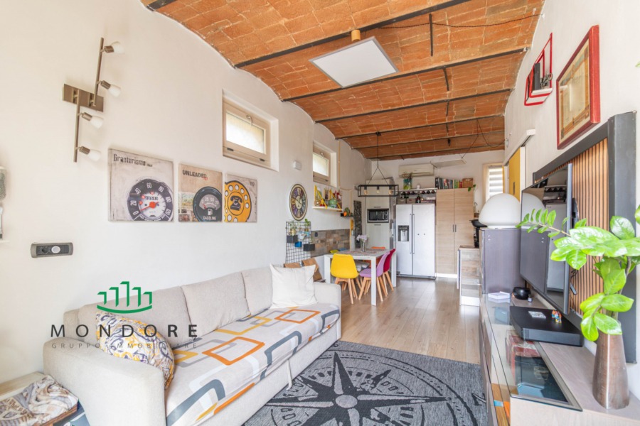 Al piano terra troviamo il soggiorno dal soffitto a volte con mattoncini a vista – elemento distintivo che dona calore agli ambienti –, angolo cottura completamente accessoriato e bagno/lavanderia dotato di doccia walk-in. Al primo piano si sviluppano due camere estremamente luminose grazie alle ampie finestre e ai velux elettrici dotati di sensore pioggia; completa il livello superiore un secondo bagno finestrato anch’esso provvisto di doccia con cromoterapia.