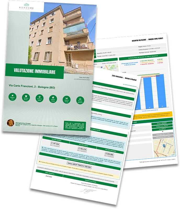 Valutazione scritta corredata dal calcolo della superficie, una selezione degli immobili venduti nello stesso stabile e nelle adiacenze negli ultimi 24 mesi corredati dal prezzo di stipula, i metri quadri catastali ed il prezzo al mq ottenuto e tante informazioni utili contenute nelle 15 pagine che compongono la nostra Stima.